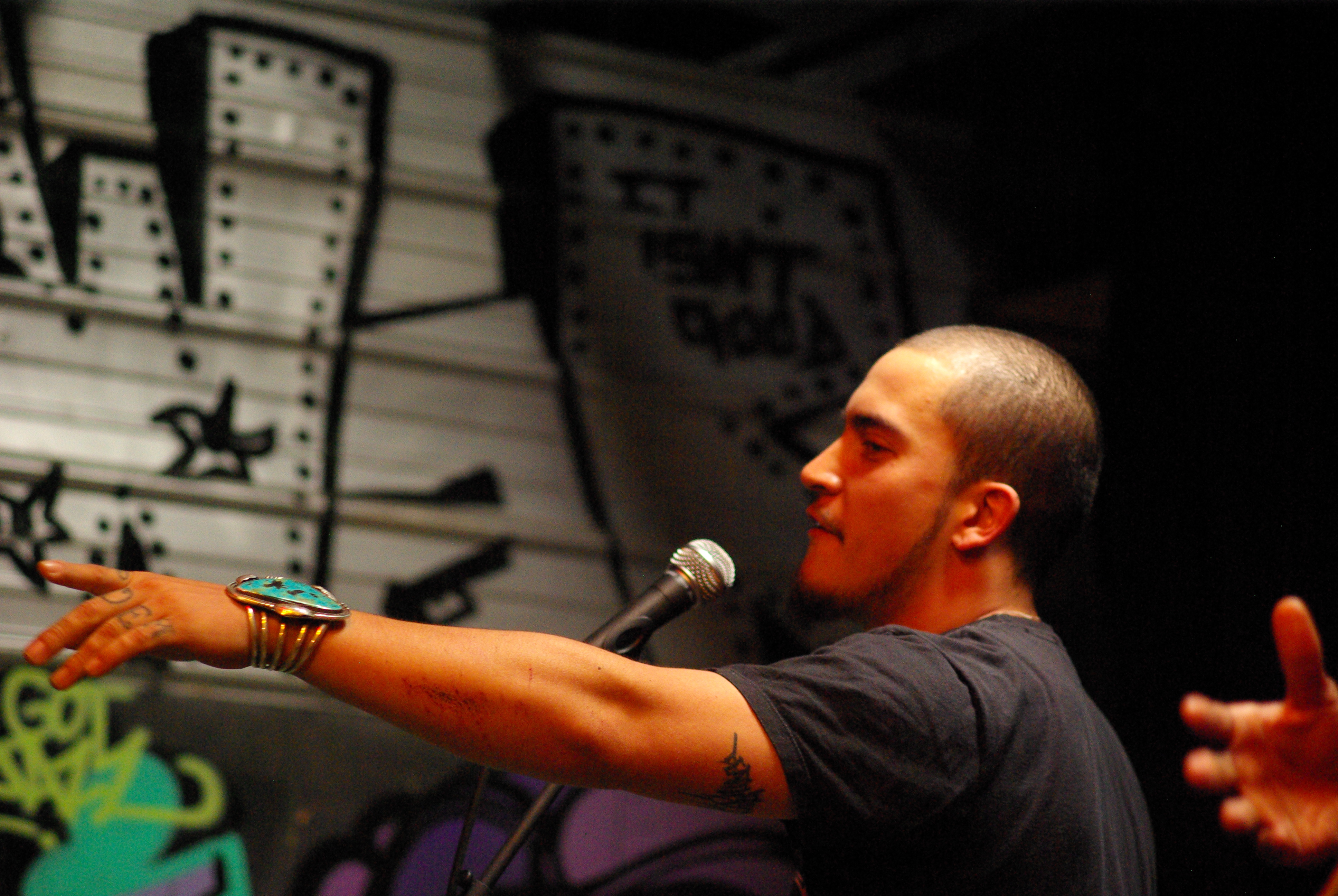 Carlos Projects ShotMy name is Carlos Contreras.  I have been twice recognized as a national champion performance poet.  I got my start in the area of competitive spoken word, or Slam Poetry.  These days, I live and work in Albuquerque, New Mexico.  Albuquerque is where I grew up and where I plan on growing old.  I work as a local educator, who leads writing workshops in the adult jail facility at the Gordon Bernell Charter School, while at the same time teaching all levels of high school English.   I love my job.  One of the things that I love about who I work with and for, is that those I work with see the passion I have for helping our community, and so yearly I am given time off to also provide services to the National Hispanic Cultural Center.  At the NHCC I play host to the National Hispanic Cultural Center’s Voces program, a writing institute for youth.  The Voces Writing Institute was awarded a Bravos Award for Excellence in Literary Arts in 2009.  I have been very blessed to be given the job as lead facilitator of the Voces program.  Over the eleven year stint that the program has enjoyed at the NHCC, I have held jobs in a number of capacities.  I originally came to the program as a student, in its initial year.  Now I help young people whose shoes I was once in, find their own voices, their own messages, and their own point of delivery.  I cherish this opportunity because it allows me to give back to an institution that has given so much to me.  It is experiences like that of teaching at such a young age, and working at the NHCC with the Voces program, that garnered me the honor of being awarded a 2012 Bravos Award, as an “Emerging Creative.”  As a young writer, driven to succeed and help the community I live and work in I have dedicated myself to change in my community by way of the spoken and written word.  Having been a member of 8 spoken word poetry teams at the college and professional level – I have used spoken word as a tool for growth, advancement, and survival.   I have visited more than 50 elementary, middle, high school, and college campuses throughout my poetry career.  I have also been the guest of and currently am the poet in residence at a correctional facility (MDC).  I am building programs around and with amazing individuals, and collaborative partners, because I view it as a responsibility I have to the preservation and advancement of arts in our communities.  I dream of a world in which I can support myself solely by way of my art, until then I will continue to work at nurturing and honing my craft.